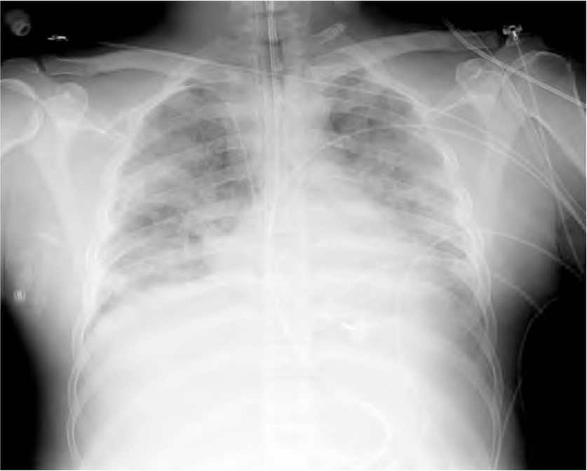 - Chest imaging: Presence of bilateral opacities in the chest imaging not completely explained by effusions, collapse, or the nodules.