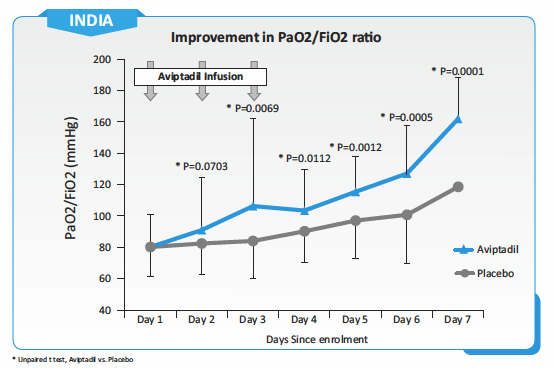 - A higher proportion of patients on Aviptadil shifted to the milder clinical state (32.43% vs 17.80%; p=0.0410 on Day 3 and 70.27% vs 45.21%; 0.0035 on Day 7) without the requirement of oxygen than the placebo group.